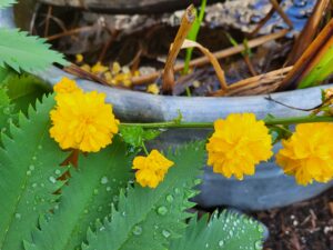 The pond and the shade garden are coming in nicely. The hellebore are still blooming like crazy, and my favorite yellow pom pom bush is showing off all its beautiful blooms.