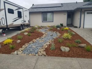 Now it was my turn. First things first. Using a hose I made an outline of the dry river bed. Then I made it four times bigger. Then, just because I was bitter that I was told I couldn’t have a large dry riverbed, I made it even bigger. I scoured Craigslist and found someone selling a pallet of river rocks for $250, that they had leftover from their own front yard project. I laid down some weed cloth and outlined the riverbed. I fell short a few rocks, but I was able to get more from a friend. They had them tossed off in a side yard and didn’t want them. FREE ROCKS!! Shweet.