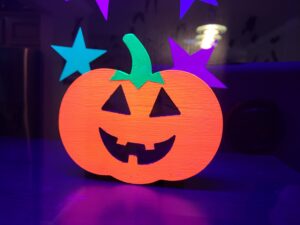 Now, just to keep hubby busy I asked him to cut out a flying witch and a moon to give my decorations that extra pop. I was happy to see that the yellow poster board I bought at the dollar store glows brightly even when the blacklight isn’t directly on it. What a cheeky little moon!