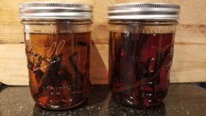 Now all you have to do is put six pieces in a 16oz jar filled with cheap Vodka. Some people like the Bourbon flavored Vodka, others prefer plain. Everyone seemed to agree that you do NOT need to use expensive Vodka. Save your money. Seal up the jars and put them someplace where you will remember to shake them a little periodically. I try to shake my jars at least once a week. Nothing crazy, just a little shakey shakey. We aren’t making milkshakes! If you miss a week or month, no biggie.