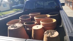 January has been pretty sunny and warm. I should be worried about droughts, but instead I think I will just enjoy it. I was lucky enough to find an ad on Facebook Market place for “Free Terracotta Pots.” The picture made it look like they were small, so I threw hubby into the minivan and raced over to the person’s home. When we got there I realized I had woefully misjudged the pots in the picture. They were HUGE! I grabbed the largest pot I could and threw it in the back of the van. I then asked the lady if I could come back with a truck. She was happy to hold them for us. There were about 15 pots total. WHAT A SCORE!